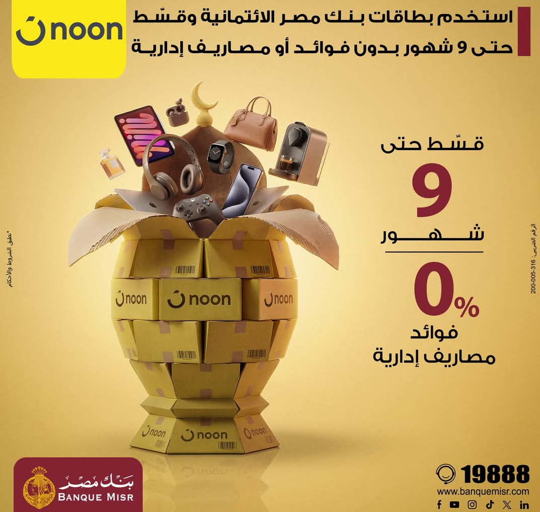 قسط حتى 9 شهور بدون فوائد.. بنك مصر يطلق عرض جديد لحاملي بطاقاته الائتمانية عبر Noon