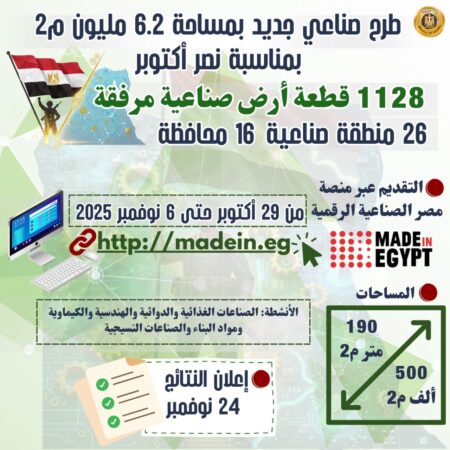 وذلك وفقًا للميزة النسبية لكل محافظة ويبدأ الطرح اعتباراً من اليوم ويستمر حتى 6 نوفمبر 2025، عبر منصة مصر الصناعية الرقمية madein.eg على أن يتم إعلان نتائج التخصيص يوم 24 نوفمبر 2025.