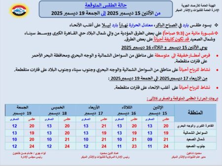 مع وجود فرص لسقوط أمطار خفيفة على بعض المحافظات الداخلية، وجنوب الوجه البحري، ومدن القناة، والقاهرة الكبرى، وخليج السويس، ومناطق من شمال الصعيد.