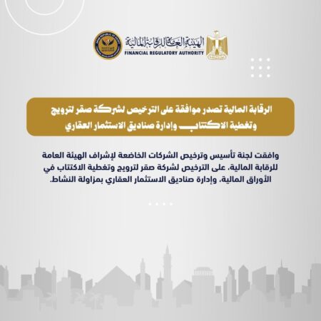 أصدرت هيئة الرقابة المالية قرارًا بالموافقة على الترخيص لشركة صقر بمزاولة نشاط الترويج وتغطية الاكتتاب وإدارة صناديق الاستثمار العقاري، وذلك في ضوء استيفاء الشركة لكافة المتطلبات القانونية والتنظيمية اللازمة لممارسة هذا النشاط وفقًا لأحكام قانون سوق رأس المال ولائحته التنفيذية.