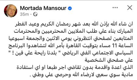 وجاء نص منشور “مرتضى” ليقول: “إن شاء الله بإذن الله بعد شهر رمضان الكريم وعيد الفطر المبارك