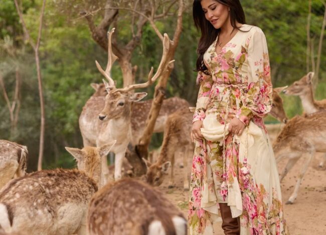 ففي إطلالتها الأولى، ظهرت جومانا بفستان طويل أنيق باللون البيج مزدان برسومات باللونين البني والفوشيا.