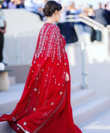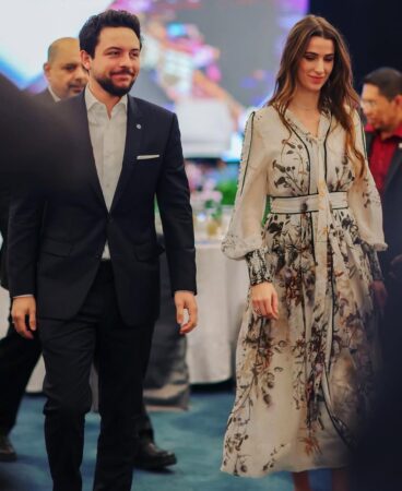 وأكملت الأميرة رجوة الحسين إطلالتها بـ حذاء أسود بكعب عال وحقيبة صغيرة أضافت توازنا ناعما في الألوان على الخلفية الداكنة للفستان