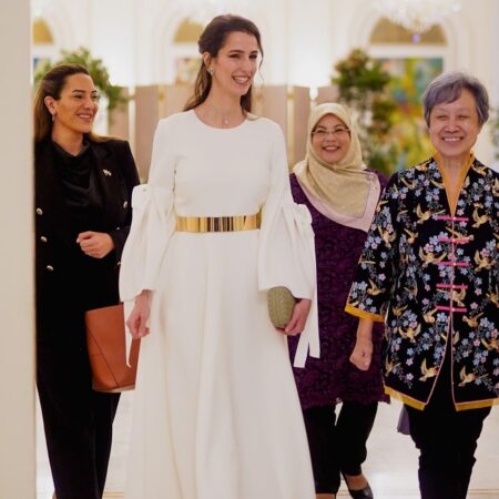لفتت الأميرة رجوة الحسين الأنظار خلال لقائها مع الرئيس الفرنسي إيمانويل ماكرون وزوجته بريجيت ماكرون، بإطلالة أنيقة اتسمت بالرقي والبساطة.