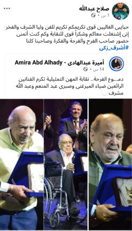 «حبايبي الغاليين قوي، تكريمكم تكريم للفن، وليّا الشرف والفخر إني اشتغلت معاكم، وشكرًا قوي للنقابة، وكم كنت أتمنى حضور صاحب الفرح والفرحة والفكرة، وصاحبنا كلنا أشرف زكي».
