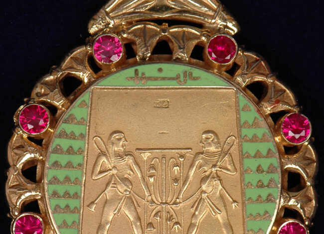 كما تتصل بالقلادة حلية دائرية الشكل عبر مشبك على هيئة زهرتي لوتس، وتزين الحلية بزخارف فرعونية دقيقة.