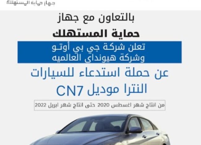 أعلن جهاز حماية المستهلك عن تنفيذ حملة استدعاء رسمية لعدد من سيارات هيونداي إلنترا موديل CN7، المنتجة خلال الفترة من أغسطس 2020 وحتى أبريل 2022.