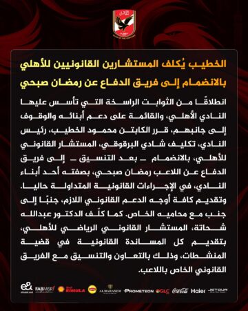 حيث أعلن النادي الأهلي تكليف “الخطيب” للمستشارين القانونيين للنادي بالانضمام لفريق الدفاع عن رمضان صبحي.