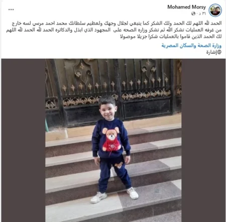 وجاء بمنشور عم الطفل على موقع التواصل الاجتماعي، “الحمد لله.. اللهم لك الحمد ولك الشكر كما ينبغي لجلال وجهك ولعظيم سلطانك.. محمد أحمد مرسي لسه خارج من غرفة العمليات..