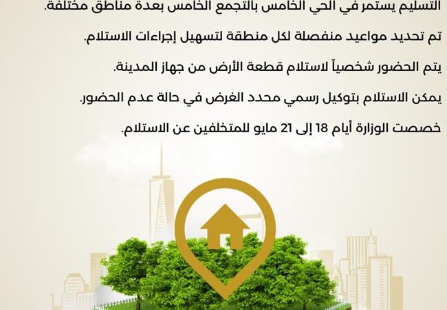وقال: سيتم تسليم قطع الأراضي بالتجمع الخامس A: يوم الإثنين 27/4/2026، وبالحي الخامس B: يوم الثلاثاء 28/4/2026، وبالحي الخامس C: يوم الأربعاء 29/4/2026، وبالحي الخامس D: يوم الأحد 3/5/2026، وبالحي الخامس E: يوم الإثنين 4/5/2026، وبالحي الخامس F: يوم الثلاثاء 5/5/2026، وبالحي الخامس G: يوم الأربعاء 6/5/2026، وبالحي الخامس H: يوم الخميس 7/5/2026.