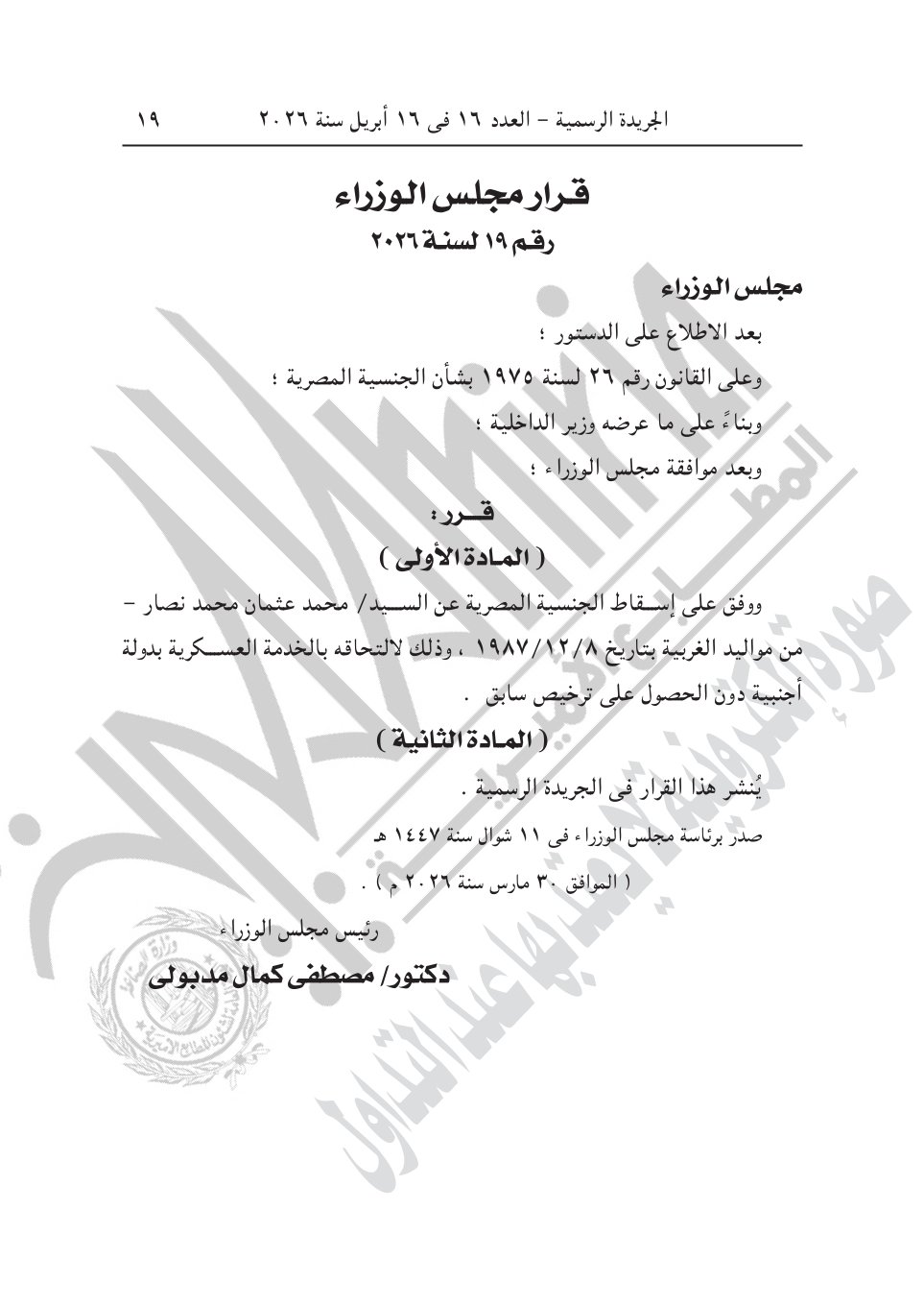 2- قرار مجلس الوزراء رقم 19 لسنة 2026، بشأن الموافقة على إسقاط الجنسية المصرية عن محمد عثمان محمد نصار، مواليد الغربية بتاريخ 1987