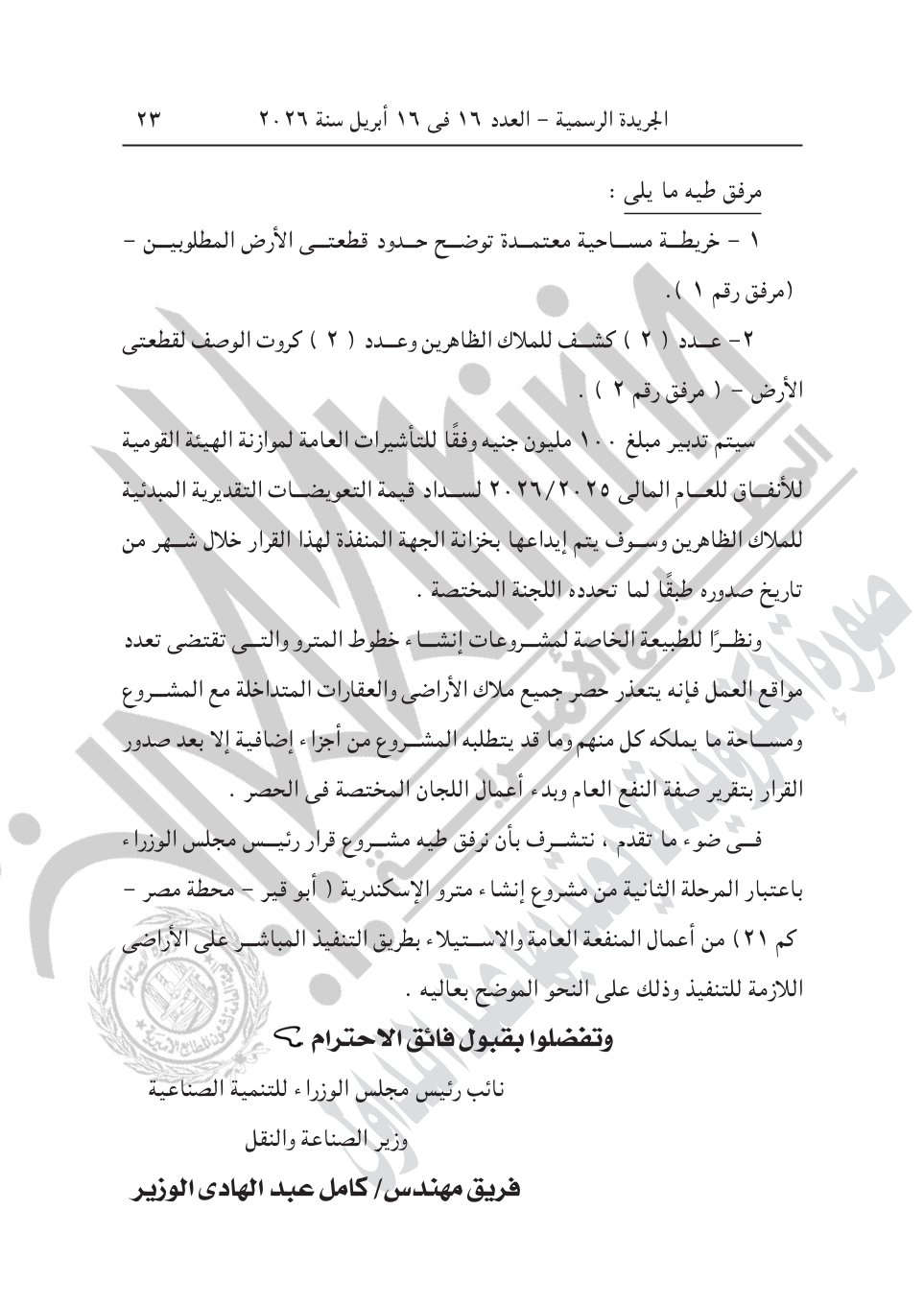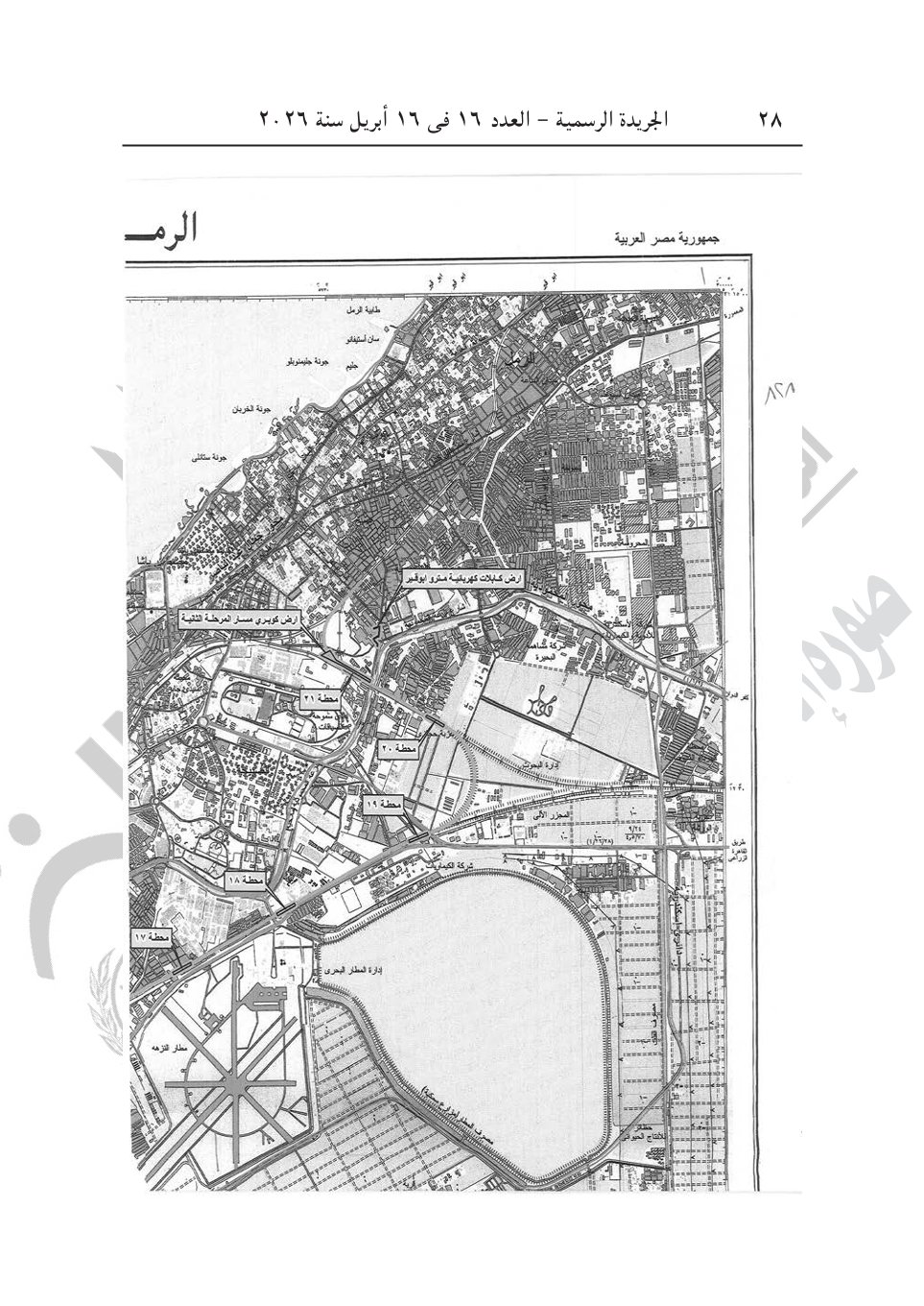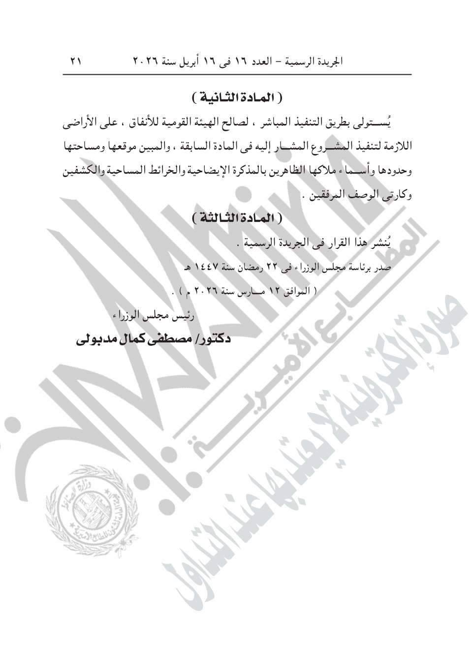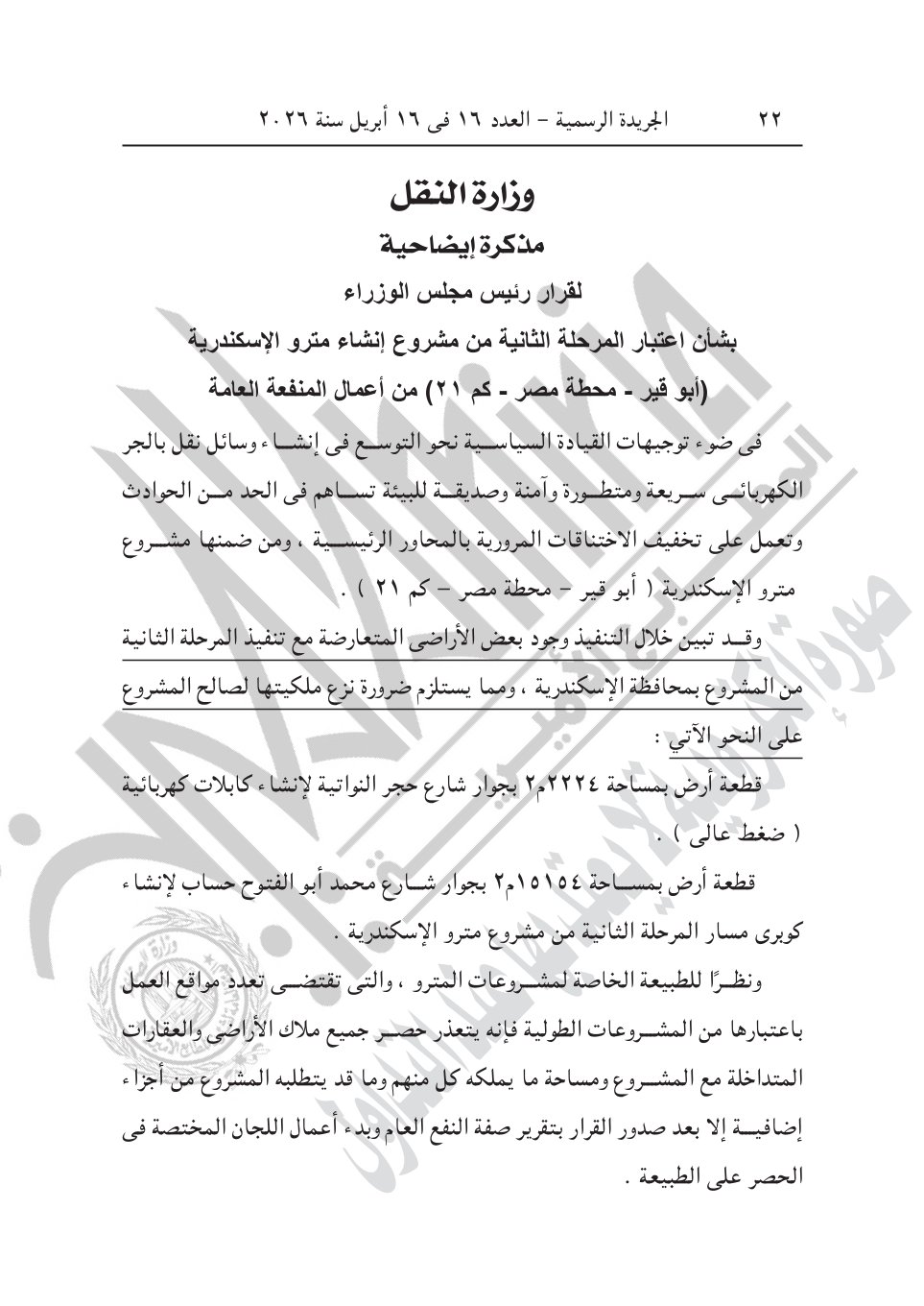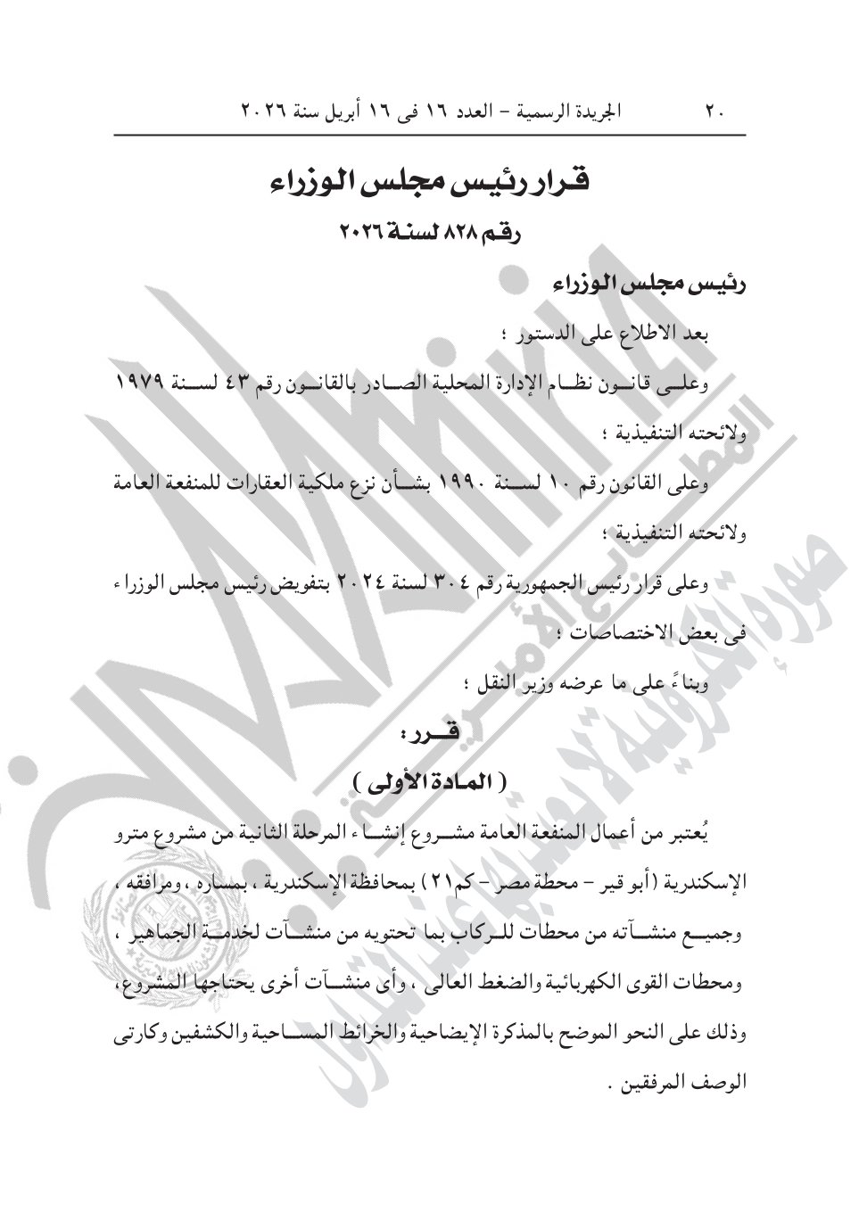 3- قرار رئيس الوزراء رقم 828 لسنة 2026، باعتبار مشروع إنشاء المرحلة الثانية من مشروع مترو الإسكندرية (أبو قير- محطة مصر- كم21) بمحافظة الإسكندرية، بمساره، ومرافقه، وجميع منشآته من محطات للركاب بما تحتويه من منشآت لخدمة الجماهير، ومحطات القوى الكهربائية والضغط العالى، وأى منشآت أخرى يحتاجها المشروع، من أعمال المنفعة العامة.