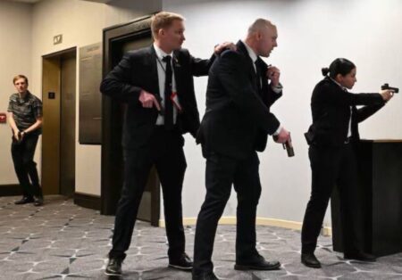 حيث أحاطت بالرئيس دونالد ترامب لتشكيل درع بشري حوله، قبل أن يتم إخراجه من القاعة بشكل منظم وآمن، بالتزامن مع انتشار قوات إنفاذ القانون داخل محيط الفندق.