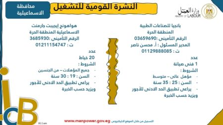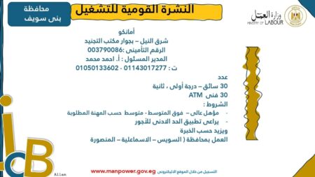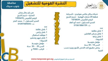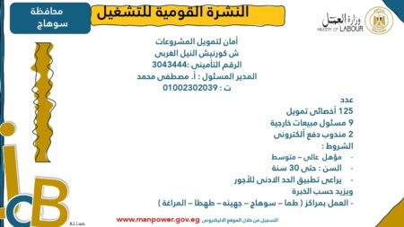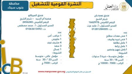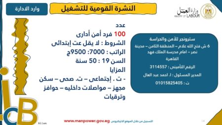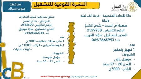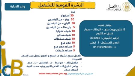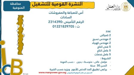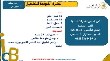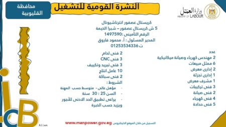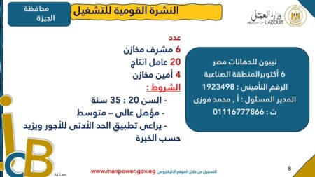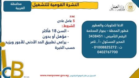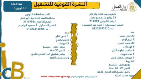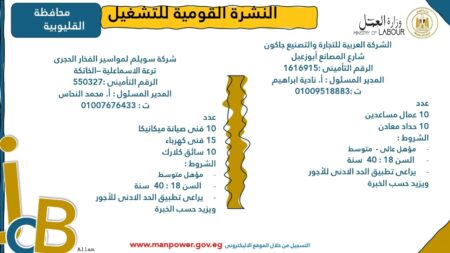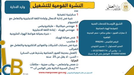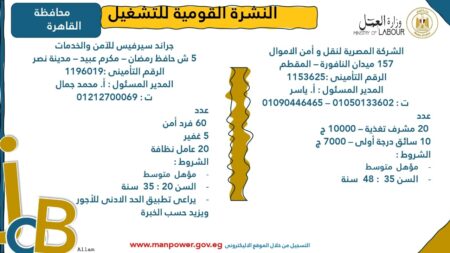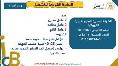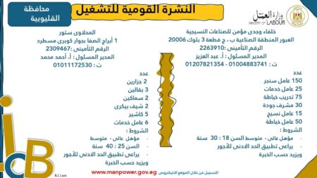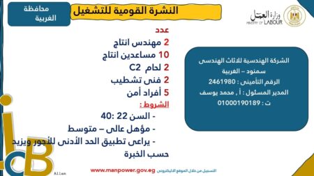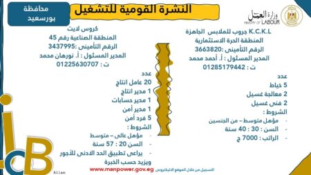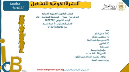 كما يمكن التقديم مباشرةً من خلال بيانات الشركات المرفقة بالنشرة، أو عبر الموقع الرسمي لوزارة العمل على شبكة الإنترنت.