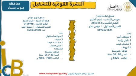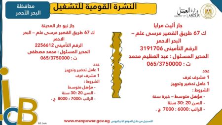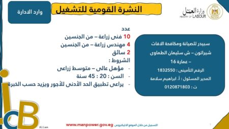 ووجه محمد جبران، وزير العمل، جميع مديريات العمل في المحافظات بضرورة المتابعة الميدانية الدقيقة لضمان استلام الباحثين عن عمل للفرص المعلنة.